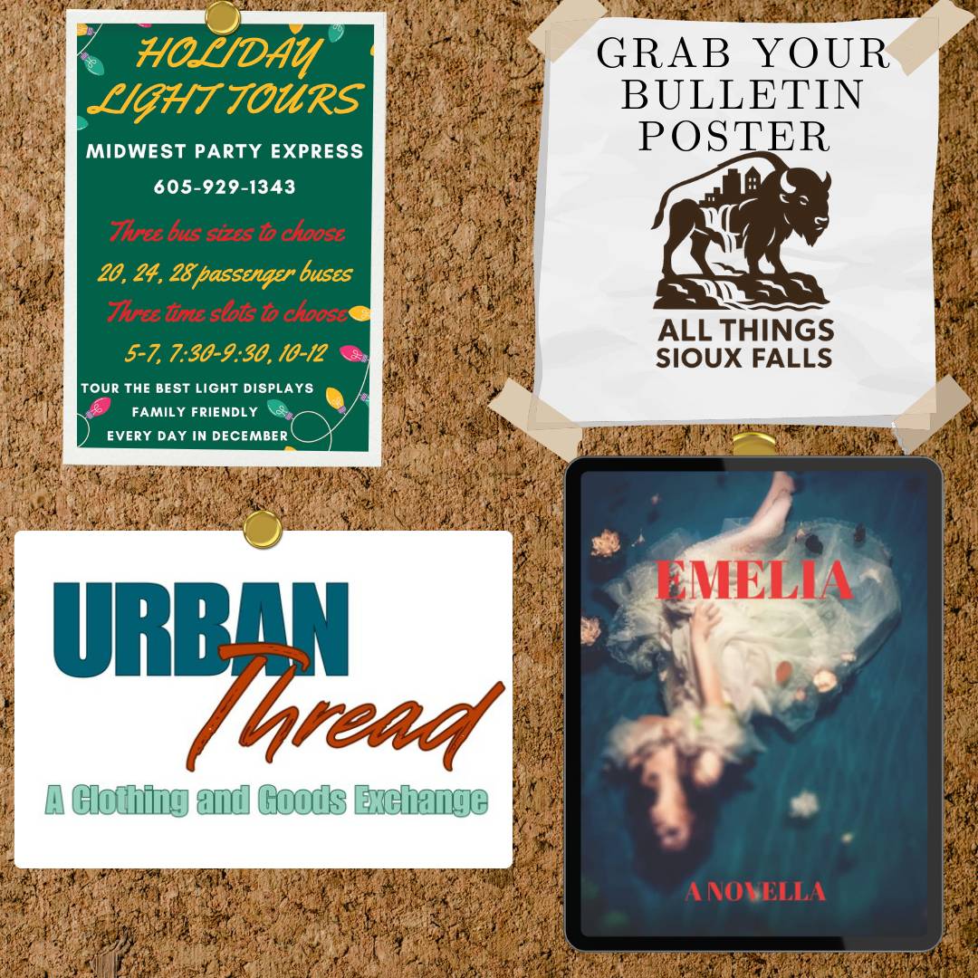 βHoliday Light Tours With Midwest Party Express: You can right now till the end of December hop aboard Midwest Party Express buses and take a a relaxing ride through the most spectacular holiday displays in town. ββUrban Thread: Introducing, Jennifer - the new kid on the block that is changing the way you look at Thrifting. Did you know that once you throw clothing out,66% live out the rest of the days in the landfill? Urban Thread offers a consignment outlet for you to declutter meaningfully and give new life to sustainable fashion. βEmelia: To free herself from the organization that raised her and made her lethal - she arranged her death, by suicide. And so, one day, she got up on a bridge, looked down at the flowing river and fell. Click here to read what happens to Emelia . β THE 605 ADVENTURESβShare An Event for Next Week's Adventures! TUESDAY 2nd ~ βBeats and Seats Cardio Class| Westside Recreation Center | 8:45am-9:30am βContracting Expo | Denny Sanford Premier Center | 9:00am-12:00pm βThe Power of Song in Respiratory Disease | Wegner Health Science Library | 12:00pm-1:00pm βZootopia 2 | Cinemark Theaters | 1:00pm-3:00pm βPottery Wheel Class | Mosaic | 5:30pm-7:00pm βChampagne and Caviar | Harvester Kitchen By Bryan | 6:00pm-9:00pm βBeginner Watercolor Workshop | Mosaic | 6:00pm-7:00pm βMake Your Own Candles | Severance Brewing Co. | 6:00pm-8:00pm βChristmas at the Castle | Sanford Children's | 6:00pm-7:00pm βTequilla Tasting Class | Dahlia Kitchen and Bar | 6:30pm-8:00pm βComedy Open Mic | Icon Event Hall | 6:30pm-10:00pm βThe Nutcracker | Washington Pavilion | 7:00pm-10:00pm WEDNESDAY 3rd ~ βSeat at the Table | Sioux Falls Young Professional Network | 12:00pm-1:00pm βVictorian Tea Party | Pettigrew Home and Museum | 2:00pm-3:00pm βNow You See Me, Now You Dont | West Mall 7 Theatres | 4:30pm-6:30pm βCountry Christmas | Stockyards Ag Experience | 5:00pm-8:00pm βMake Cat Crafts for Seniors | Tuthill Park | 6:00pm-7:00pm βYoga with Cats | Cattitude Cafe | 6:00pm-7:00pm βMusic Bingo | Fernson Brewing Co. | 6:00pm-9:00pm βInfrared Circuit Workout | 605 Burn Fitness | 6:30pm-7:15pm THURSDAY 4th~ βWater Aerobics for Seniors | Midco Aquatic Center | 7:00am-7:45am βAgOutlook 2025 | Ramkota Exhibit Hall | 8:30am-5:00pm βMake a Tree Ornament | AMC Collective | 12:00pm-6:00pm βThe Little Mermaid Part 2 | Dakotabilities | 1:00pm-3:00pm βMake Tie Blankets For Pups Free | Altered Species Ales | 5:00pm-8:00pm βLight the Village Ceremony | Veterans Community Project | 5:00pm-7:00pm βWinter Container Workshop | Landscape Garden Center | 5:30pm-7:30pm βPour Your Own Epoxy | Remedy Brewing Co | 6:00pm-8:00pm βOrnament Workshop | Terra Shepherd Boutique | 6:00pm-8:00pm βChristmas Card Writing | Holiday Hope Foundation | 6:30pm-8:00pm βLadies Night | J&L Harley Davidson | 6:30pm-9:00pm βFree Lefse Making Seminar | Nybergs Ace | 6:30pm-8:30pm βMadBall Live | Icon Event Hall | 6:30pm-11:00pm βLadies Night After Hours Sale | Shop Dog Boutique | 7:00pm-9:00pm βFreedom on Tap | Americans for Prosperity | 7:00pm-8:00pm βHoliday for Fiddlers | Live on Stage | 7:00pm-9:00pm βMens Bash | Big Sioux Powersports | 7:00pm-9:00pm βLive Comedy | The Bar | 8:00pm-11:00pm FRIDAY 5th ~ βFish Fest | Scheels | 9:00am-6:00pm β2026 World Cup Draw | Gibs Sports Bar | 11:00am-1:00pm βThe Book Club | Transitions: Doula and Life Services | 11:30am-1:30pm βThe Art Collective | Washington Pavilion | 1:00pm-8:00pm βFirst Free Friday | Washington Pavilion | 5:00pm-8:00pm βTalk and Exchange | Women of Armed Forces | 5:30pm-7:00pm βUgly Sweater Contest | The Thirsty Duck | 6:00pm-11:00pm βCandy Cane Hunt | Jacobson Plaza | 6:00pm-8:00pm βHoliday Pop Up Shop | The Premire Playhouse | 6:00pm-9:00pm βKrampusnacht | Federal Plaza at Philips Ave | 6:00pm-8:00pm βKnit Gnome Workshop | AR Workshop | 6:30pm-8:00pm βBrass Holes Live | Phils Pub | 7:00pm-10:00pm βChristmas Vesperts 2025 | Augustana University | 7:30pm-9:00pm βSingo In The City | Giving Hope Bingo | 9:30pm-11:45pm β βHoliday and Craft Show | Edgewood Assisted Living | 9:00am-3:00pm βBricks and Brews |Lavas Coffee | 9:00am-11:00am βWinter Farmers Market | Mosaic | 9:00am-2:00pm β605 Made Holiday Market | Cherapa Place | 10:00am-4:00pm βGlobal Fat Bike Ride Day | Shenanigans | 10:00am-12:00pm βCustom Paw Print Ornament | Color Me Mine | 10:00am-6:00pm βSanta at the Zoo | Great Plains Zoo | 10:00am-2:00pm βHoliday With Heart: Retail Open House | Girl Scouts | 10:00am-2:00pm βHoliday Herth Event | Fireplace Professionals Inc | 10:00am-2:00pm βSanta Gets a New Sleigh Event | Vern Eider Motoplex | 10:00am-2:00pm βNorth Pole Holiday Party | The Social | 11:00am-1:00pm βCookies with Santa | The Empire Mall | 11:00am-1:00pm βO'Gorman Jazz Combo | R Wine Bar and Kitchen | 12:00pm-2:00pm βGrinchmas | Stensland Ice Cream | 2:00pm-5:00pm βHoliday Trees | Good Earth State Park | 5:00pm-7:00pm βEarn the Gift Gala | Sioux Falls Convention Center | 5:00pm-9:00pm βCharlie Brown Christmas | Dada Gastropub | 5:30pm-9:30pm βChad Madsen Live | Alibi Bar and Grill | 7:00pm-9:00pm βThe Premiere Podcast Live | The Premiere Playhouse | 7:00pm-8:30pm βHumbug by John Wooten | Mighty Corson Art Players | 7:30pm-8:30pm βBlack Stone Cherry Live | The District | 7:30pm-11:00pm βFree Wristband Light the Night | PAve | 8:00pm-1:00am βLive Reindeer Event | Hy-Vee on Marion | 8:00am-10:00am βPancake Breakfast with the Clauses | American Legion | 8:30am-12:00pm βAdult Dodgeball Tournament | O'Gorman | 10:00am-4:00pm βDecember Flea Market | W.H. Lyon Fairgrounds | 10:00am-3:00pm βPup Holiday Photo Fundraiser | Remedy Brewing Co. | 11:00am-6:00pm βHoliday Friends and Family Shop | The Buckle | 11:00am-7:00pm βChristmas Village Display | Bricks and Minifigs | 11:00am-4:00pm βFabric and Trims Rummage | Barbara's Needlepoint | 12:00pm-4:00pm βShadows and Light Showcase | Aerial and Arts | 12:00pm-5:00pm βHoliday Porch Pot | 605 